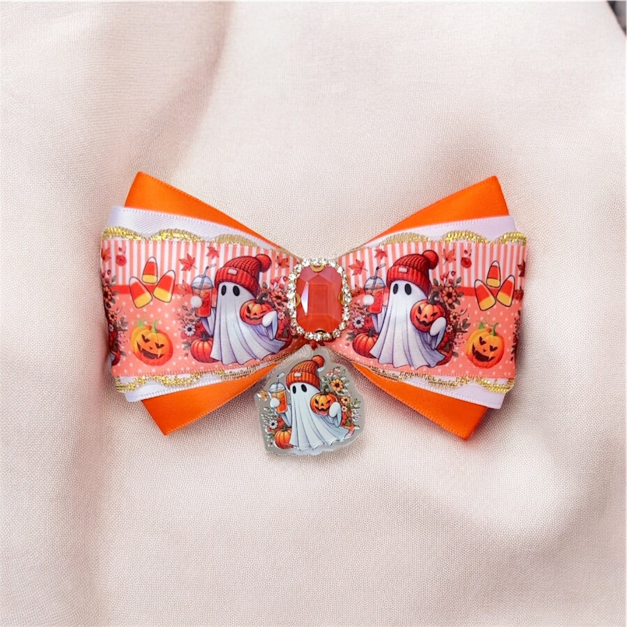 Get ready for some boo-tiful style with our Cozy Ghost Bow! This charming Halloween accessory features an adorable ghost dressed in a cozy red beanie, surrounded by pumpkins, candy corn, and festive fall vibes. The bright orange and white tones are highlighted with golden trim and a sparkling gemstone centerpiece, plus a matching dangling charm for extra cuteness. Perfect for Halloween parties, pumpkin patch trips, or just adding a playful spooky touch to your look!