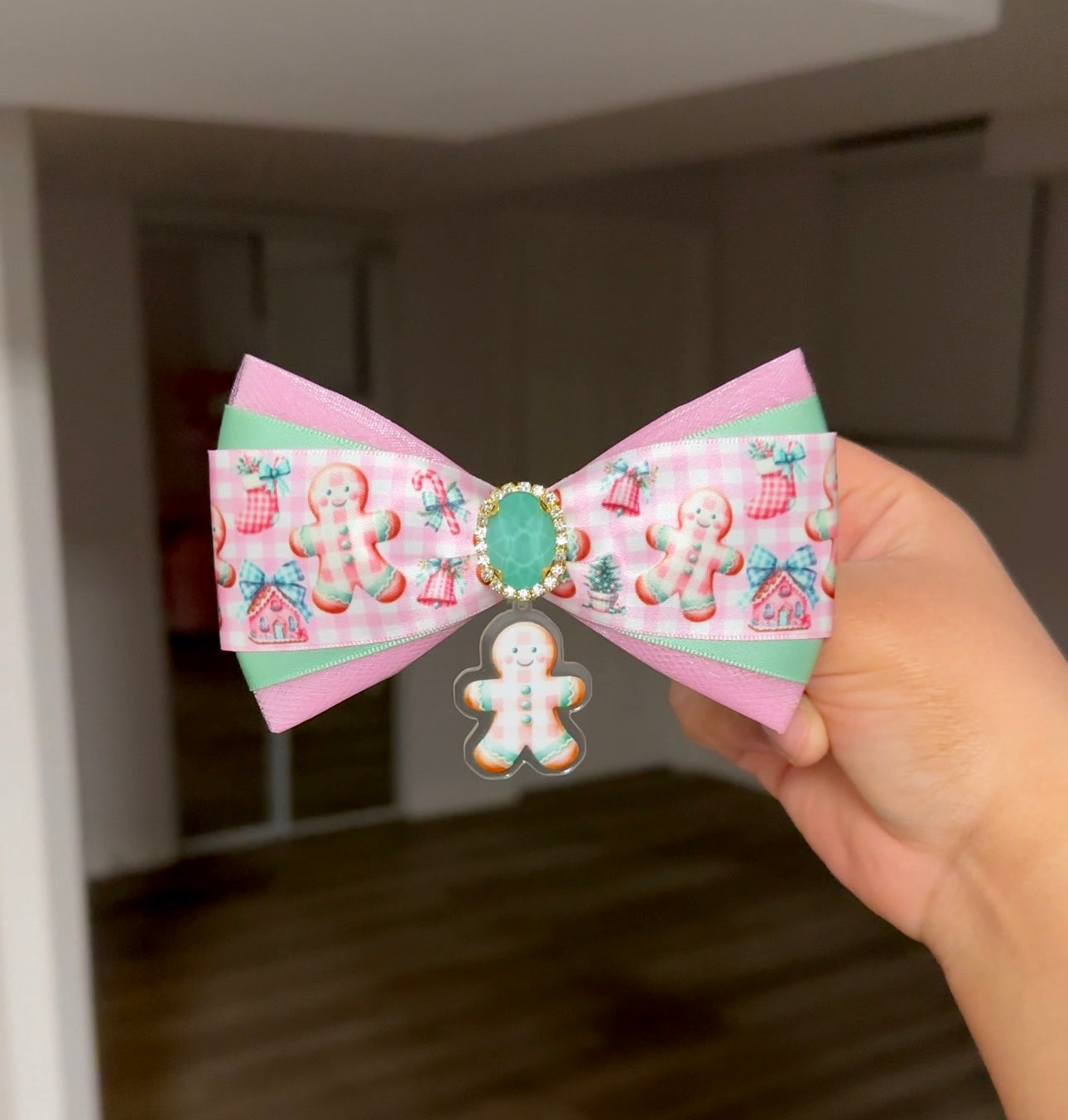 A sweet twist on a holiday classic, the Gingham Christmas Bow combines soft pink and mint hues with smiling gingerbread friends, dainty holiday icons, and a sparkling mint jewel centrepiece. The dangling gingerbread charm adds the perfect touch of festive whimsy, making this bow feel straight out of a pastel Christmas bakery. Perfect for holiday photos, cozy outfits, or matching family Christmas looks.