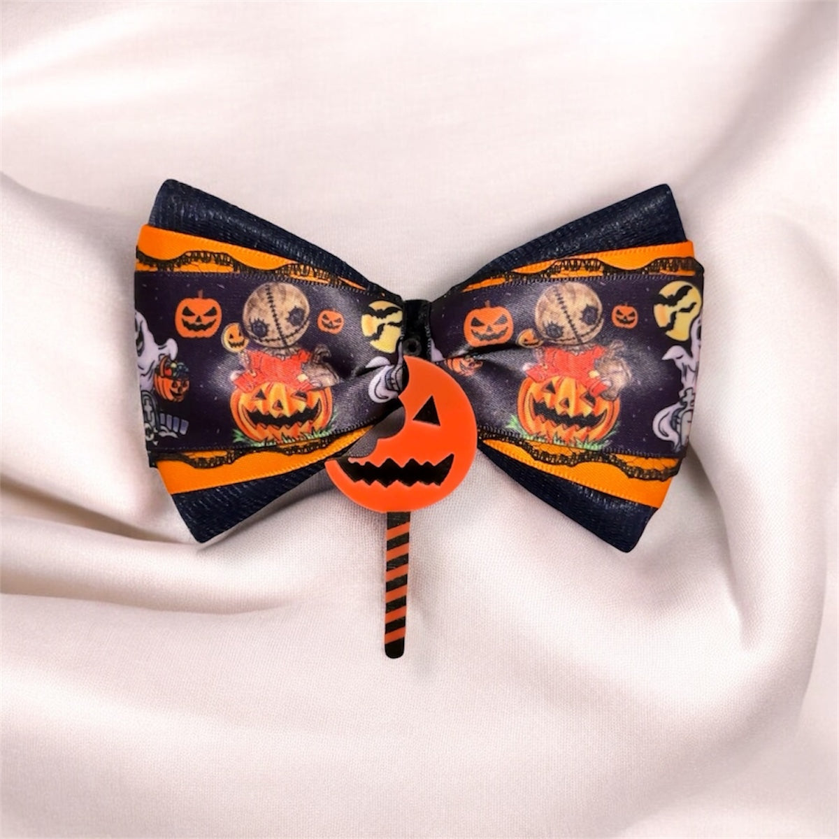 Bring the Halloween fun to life with our Pumpkin Pop Bow! Featuring bold black and orange tones with spooky jack-o'-lanterns, bats, and ghostly details, this bow is all about festive fright-night vibes. The centrepiece is a playful pumpkin lollipop charm that adds a sweet twist to its spooky style. Perfect for trick-or-treating, costume parties, or anyone who loves Halloween candy and pumpkin fun, this bow is a seasonal must-have!