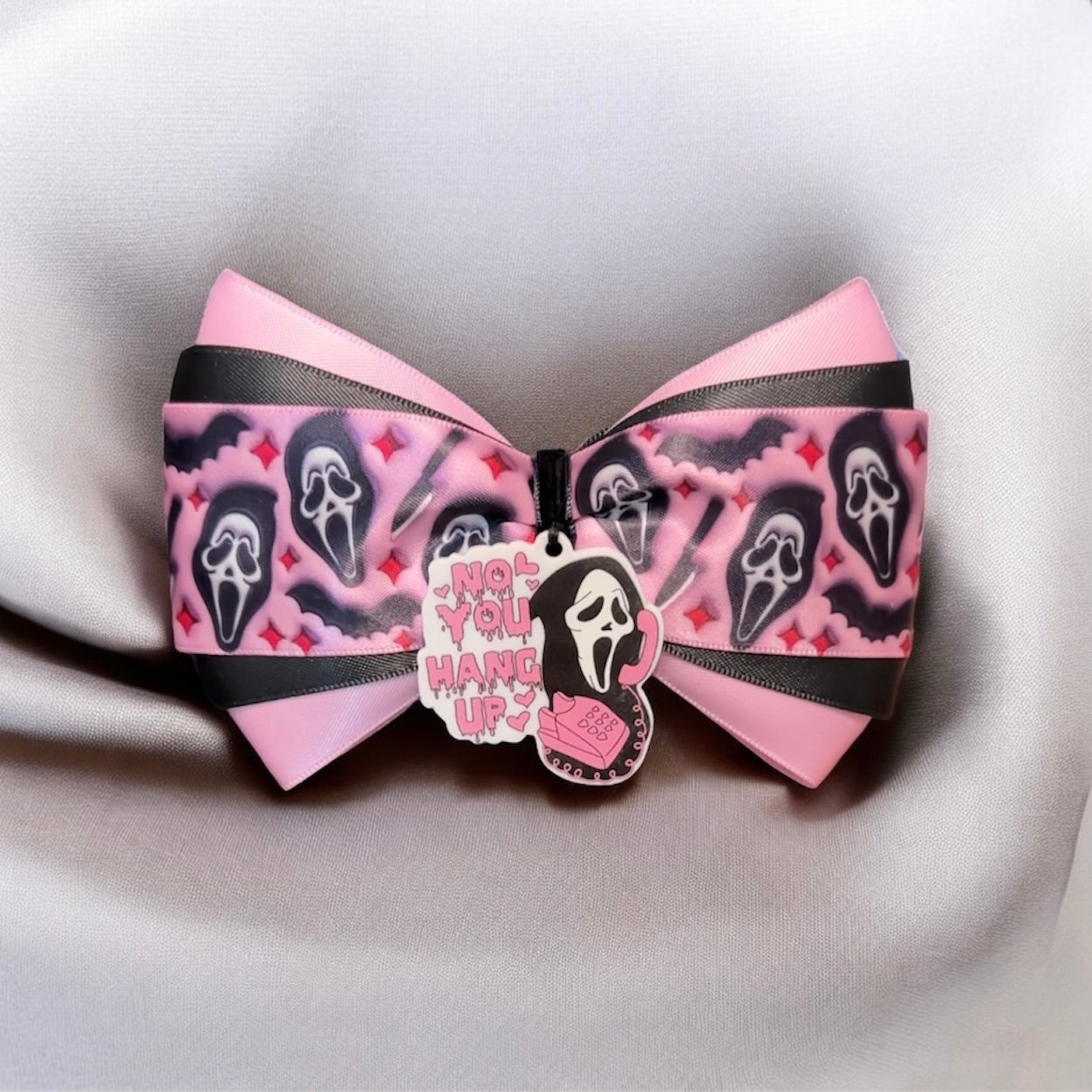 This Scream-themed bow is a must-have accessory for any fan of the iconic horror movie. The intricate design and high-quality materials make it perfect for elevating a Halloween costume or adding a spooky touch to everyday outfits. With its unique and recognizable style, this bow is sure to make a statement.