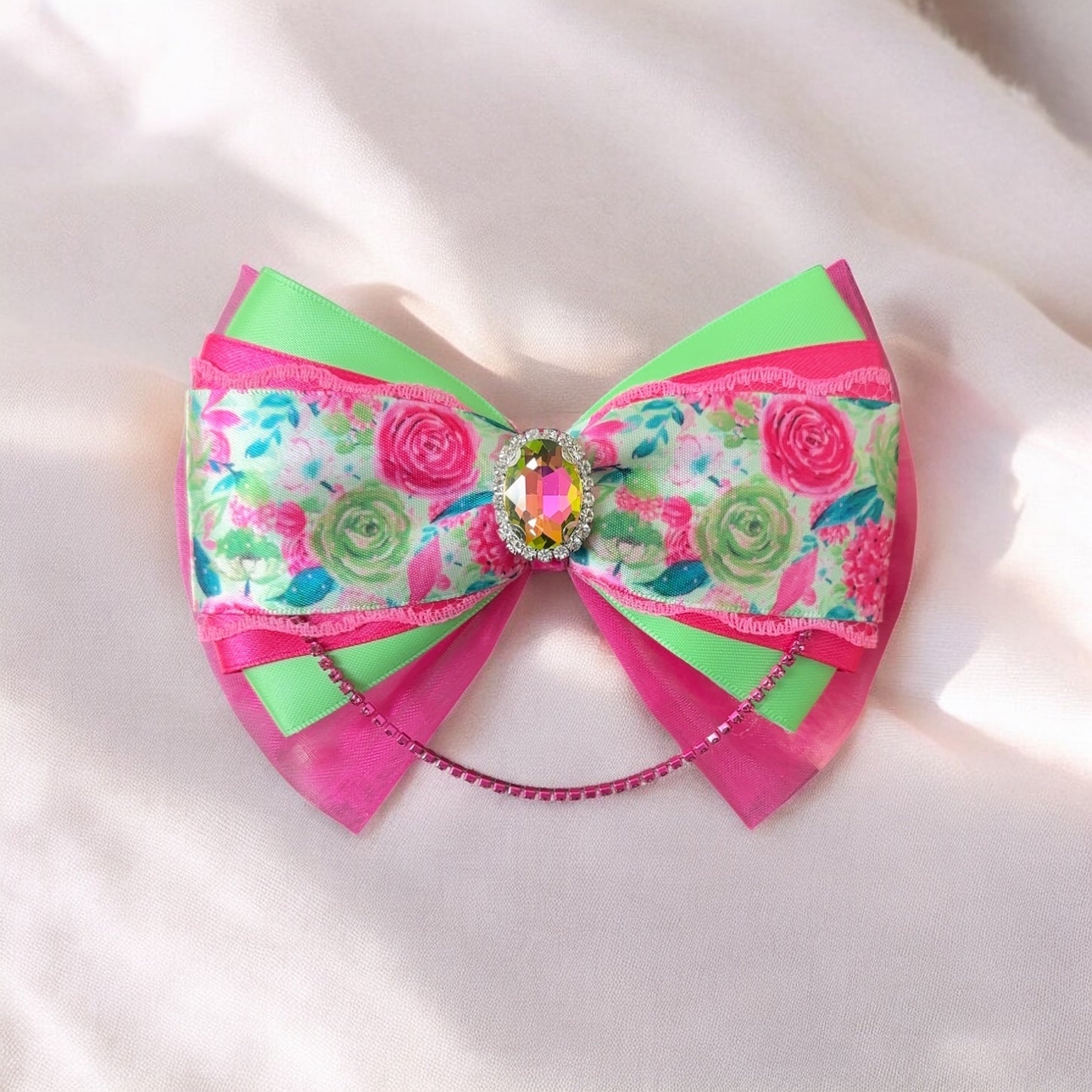 Let your pet blossom in style with our Blushing Bloom bow! This eye-catching accessory features layers of vibrant hot pink and neon green ribbons, topped with a soft floral print bursting with roses and peonies in shades of fuchsia, green, and teal. A sparkling rhinestone jewel sits at the center, adding just the right amount of glam. Finished with a delicate pink chain detail, this bow is perfect for spring strolls, photoshoots, or any occasion that calls for a touch of floral flair.