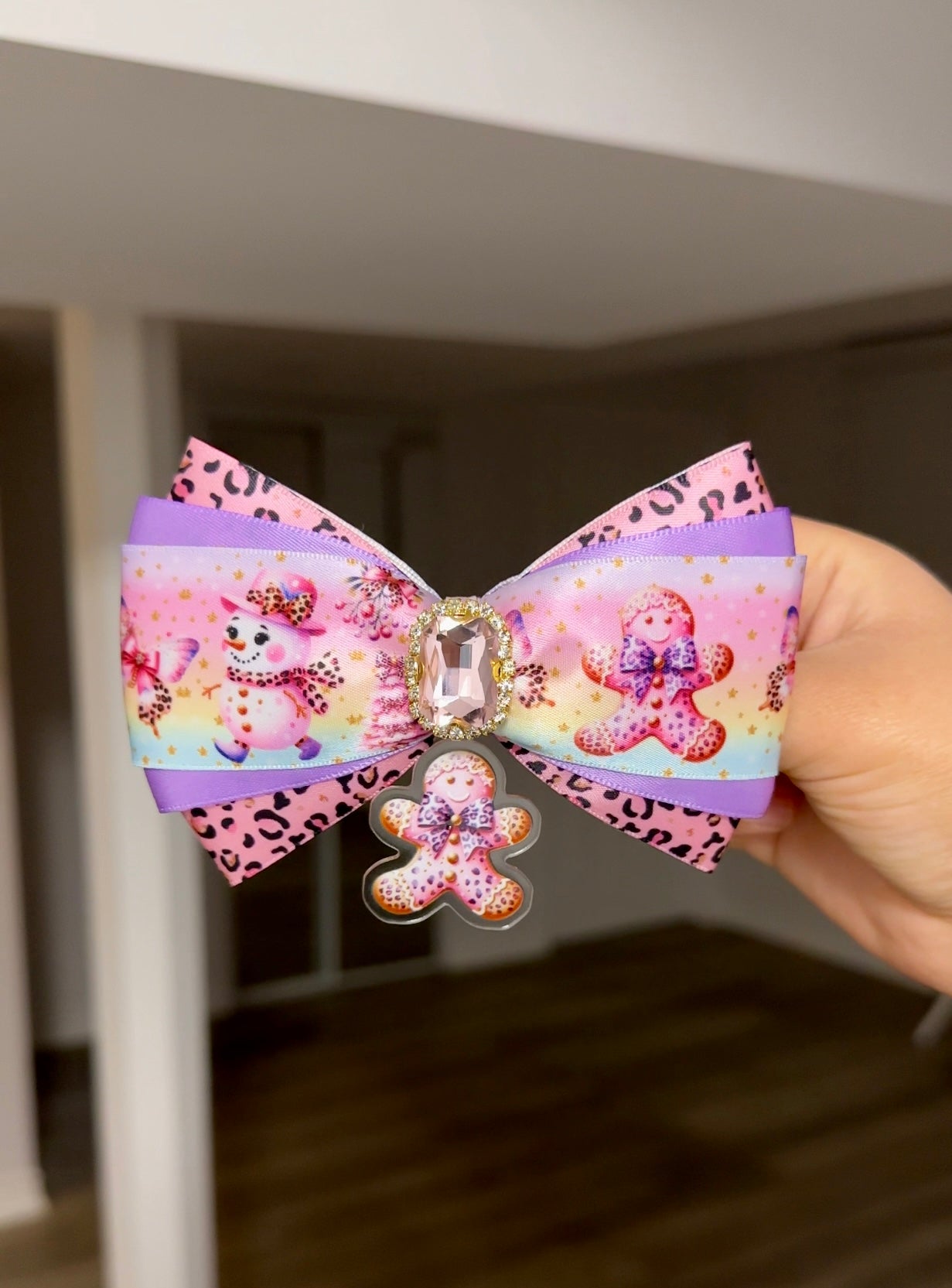 When sugar meets sparkle and a touch of wild, say hello to Christmas in Leopard. This showstopping bow blends lilac shimmer, pink leopard print, and dazzling gingerbread details for the perfect mix of festive and fierce. Complete with a sparkling gemstone centerpiece, it’s the ultimate statement piece for pets who love to stand out during the holidays.